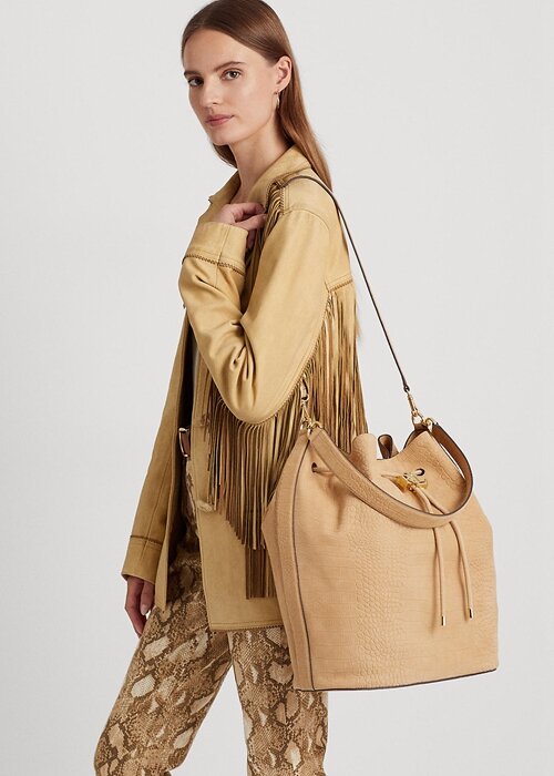 Designed with a spacious body for storing your essentials, Lauren’s signature Andie drawstring bag is distinguished by a luxurious crocodile-embossed nubuck leather construction. It’s embellished with an oversize “LRL” metal stopper for an iconic Lauren Ralph Lauren look.