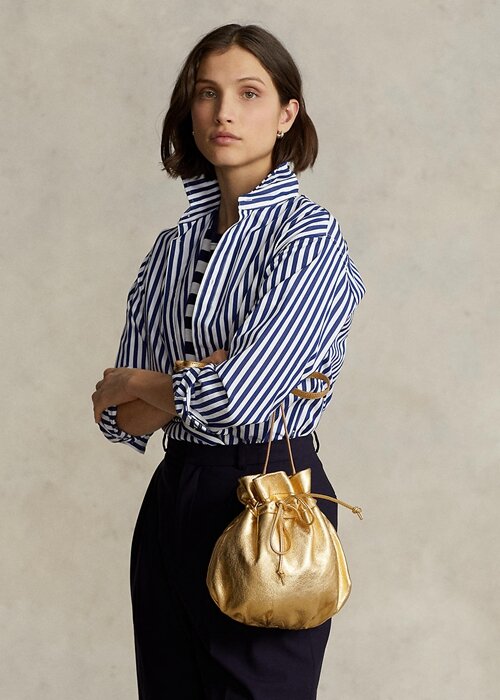 Our signature Pony, in foil-embossed and cutout form, defines the iconic look of this drawstring purse, which is rendered in Italian leather with a light weight and a metallic finish.