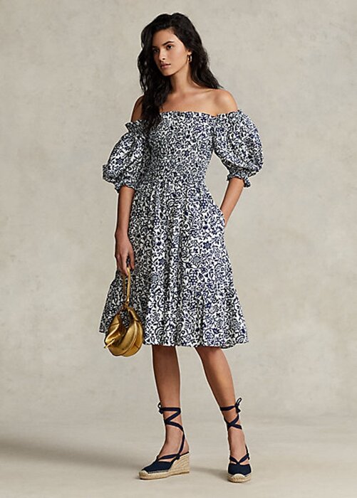 Channeling the spirit of travel, this off-the-shoulder dress is crafted with breathable cotton featuring a two-tone floral motif. Its smocked bodice and shirred tier enhance its fit-and-flare silhouette, while short blouson sleeves add volume.